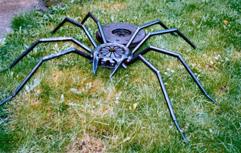 Big Spid is made from a flywheel, a clutch plate, hedgetrimmer fingers, ball bearings and assorted bits of steel bar. It is painted with smooth black Hammerite.
