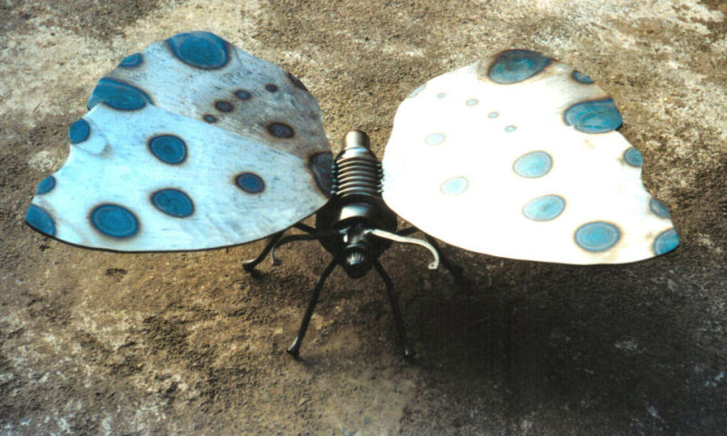 Butterfly is made from a printing press part, parts of a CV joint, part of a driveshaft, a circlip, pushrods and steel sheet. The wing colouration was produced with the heat of a gas torch and it is finished with clear cellulose lacquer.